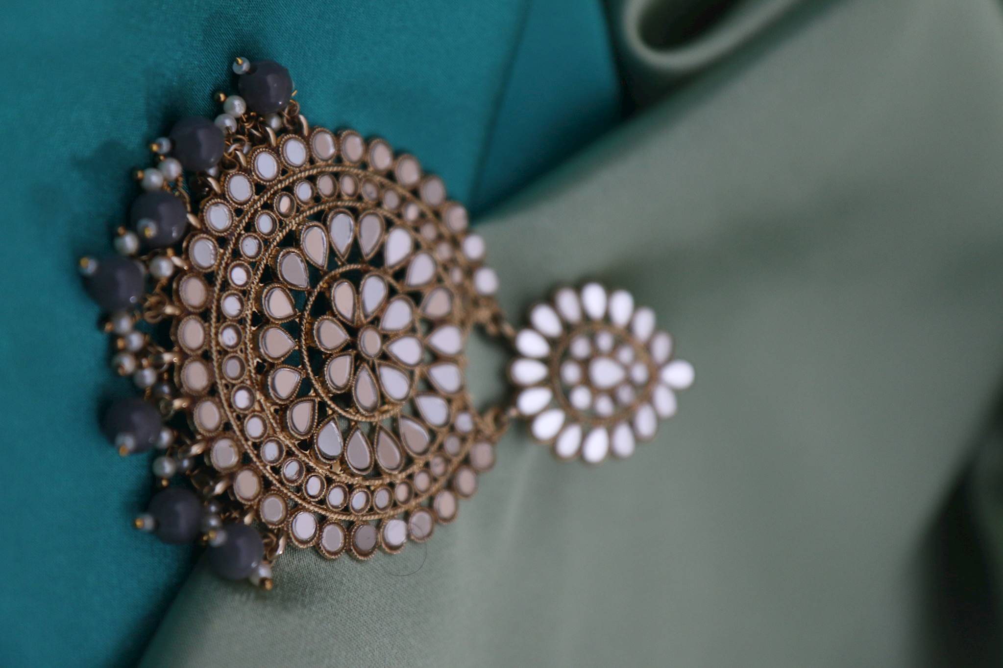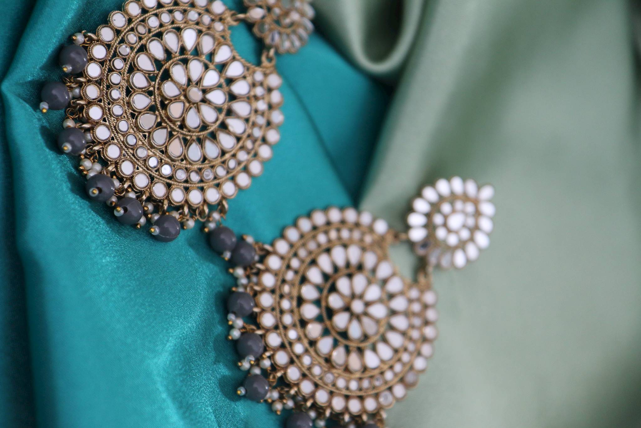 Deze bevat oorbellen en een maangtikka. Het is een prachtige mirror set. De oorbel heeft prachtige spiegeltjes en witte/ grijze gekleurde kralen. Deze set is relatief licht van gewicht. Het is een statement set. Een echte eyecatcher
